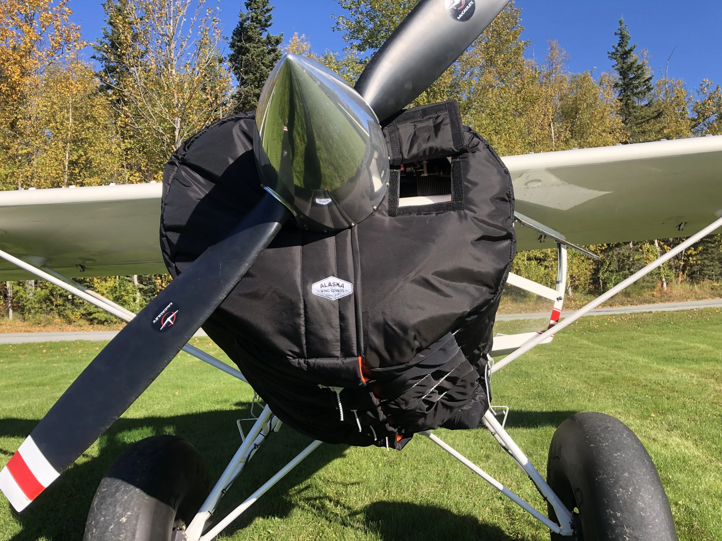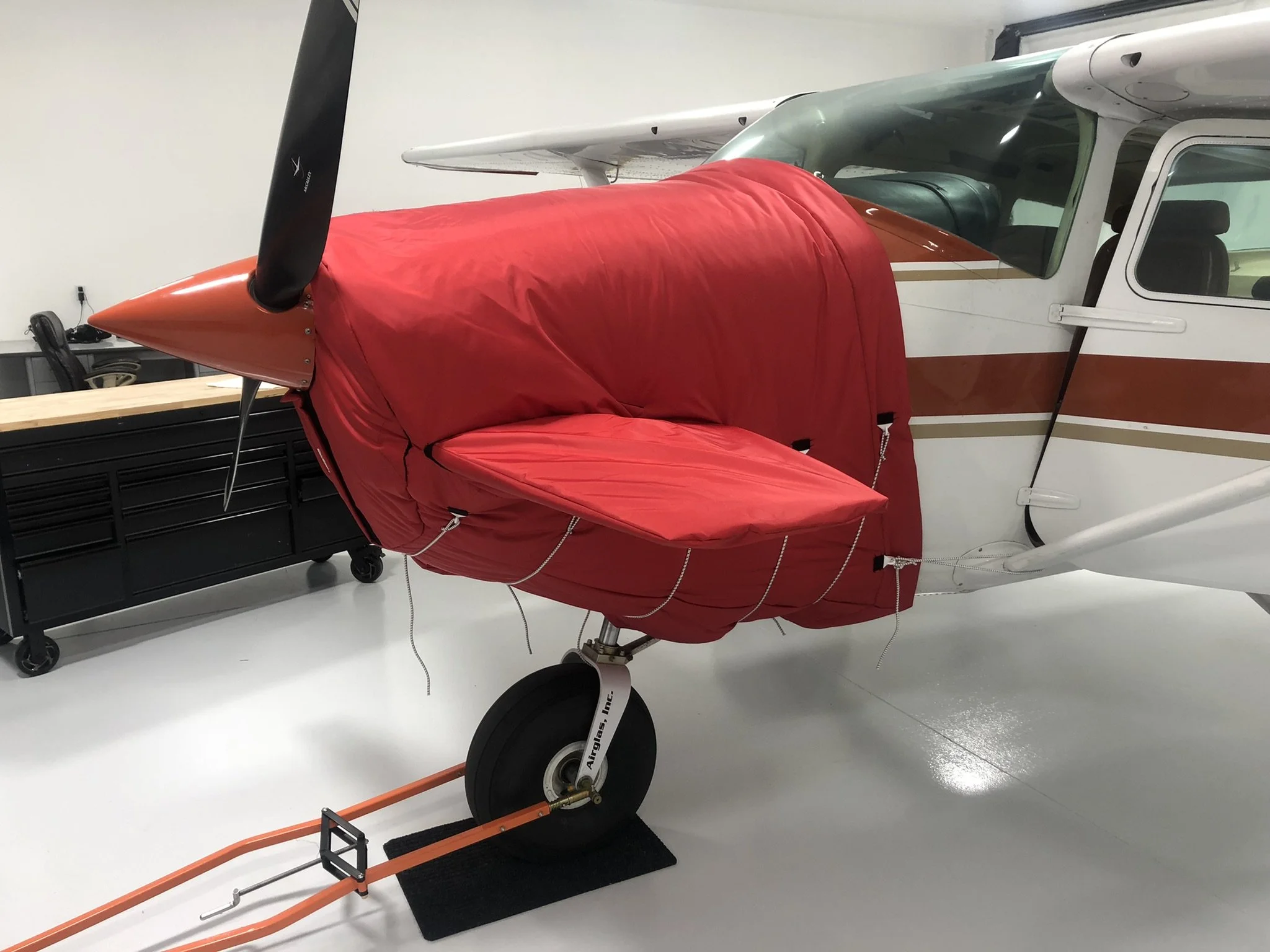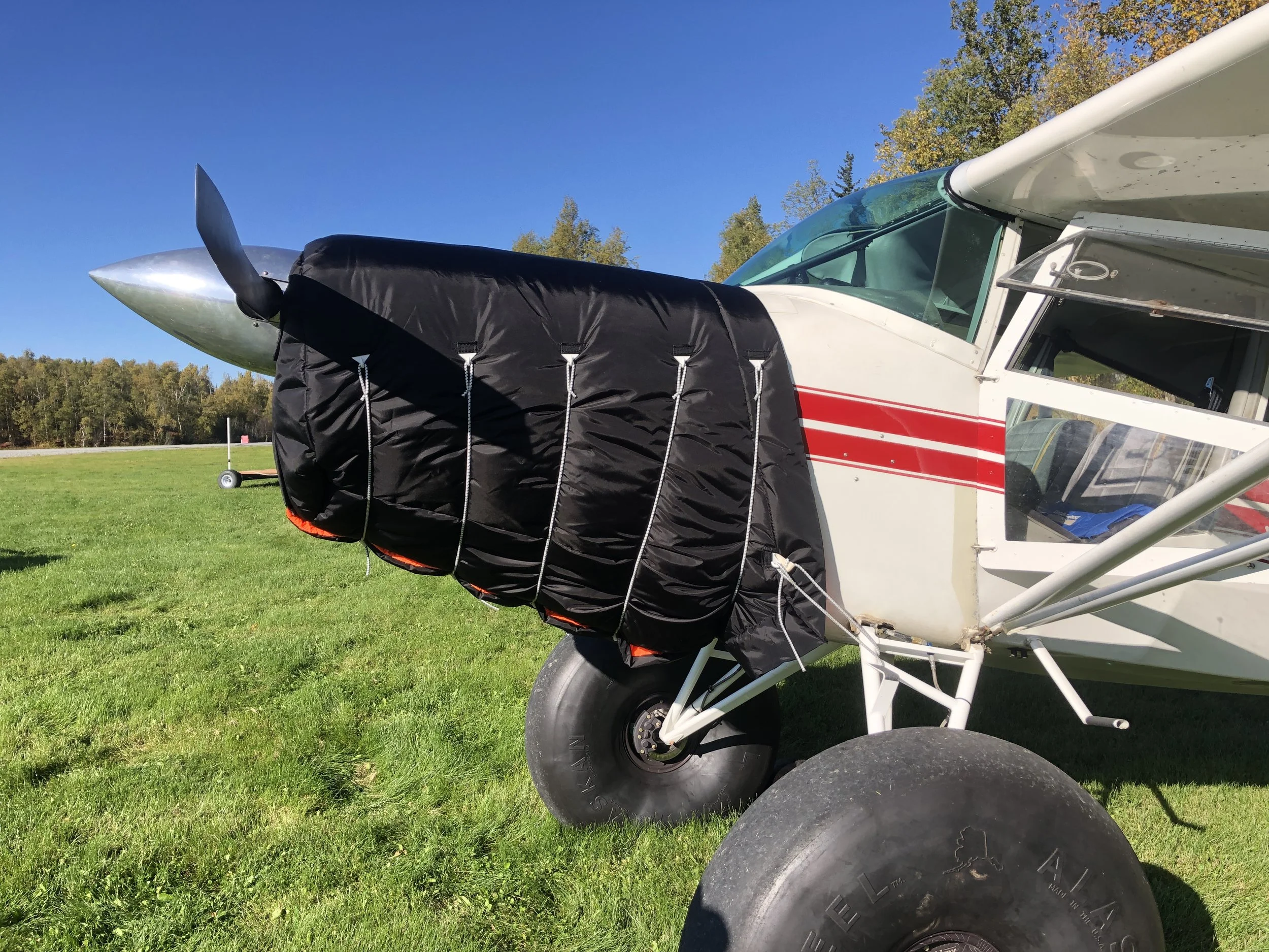 Aircraft engines have no tolerance for starting in cold temperatures and are costly to replace. Preheating to operating temp is essential as is maintaining that heat between flights. Minimizing airflow is key to maintaining that heat. Our engine covers fit snug to minimize airflow and maintain that heat, We utilize several key features in the construction of each cover even if the application is unique. Our covers are custom made to your particular aircraft. Like our other products, they are available in blue, red and of course, black. Our covers include insulation made of a Hollowfill type material and we line the inside of all of our engine covers with International Orange.